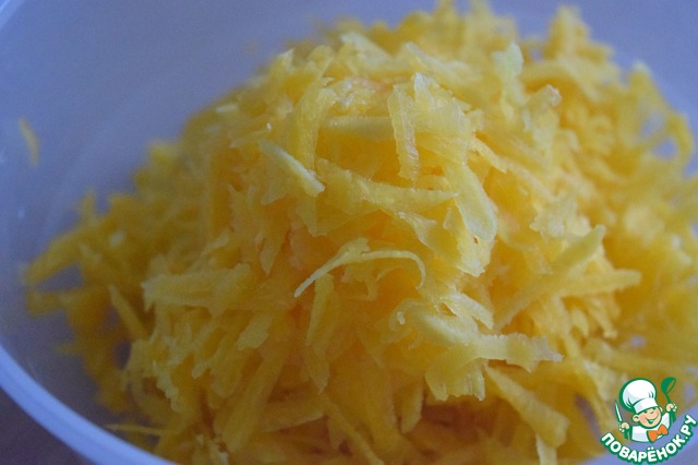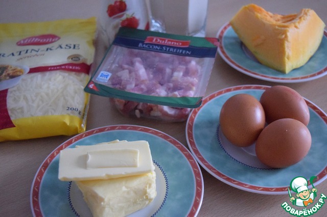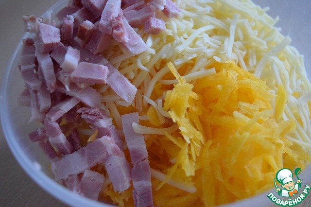 К натёртой тыкве добавляем 50 г лука-порея колечками ( я готовила без него ), 100 г тёртого сыра и 50 г бекона, нарезанного тонкими брусочками.