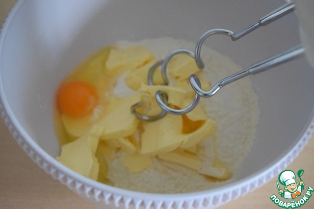 Добавить кусочками 120 г холодного сливочного масла, яйцо и всё взбить миксером с крючкообразными насадками