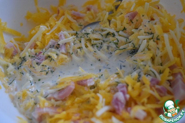 150 мл сливок смешать с яйцами. Посолить и поперчить по вкусу, добавить тёртый мускатный орех и 2 ст. л. порезанного укропа или петрушки. Перемешать.