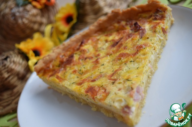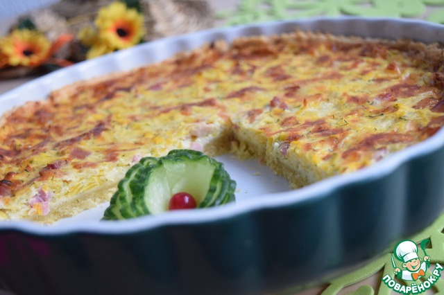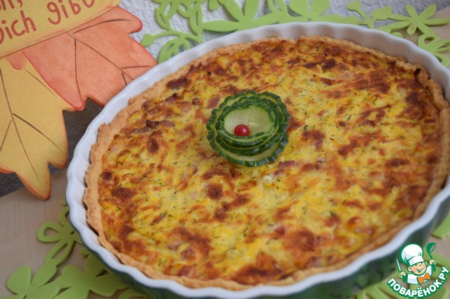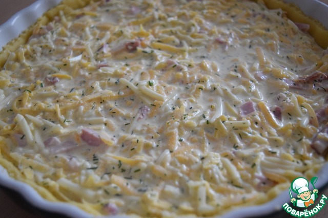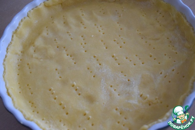 Тесто достаём из холодильника, раскатываем ( рекомендую раскатывать между двумя слоями пищевой плёнки ) и распределяем по форме d.24 см, делая бортики ( бортики невысокие, для киша). Накалываем тесто вилкой. Смазывать и посыпать форму ничем не нужно.