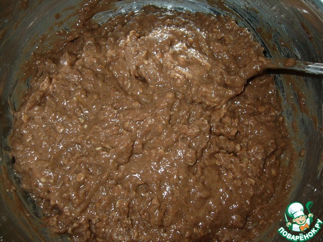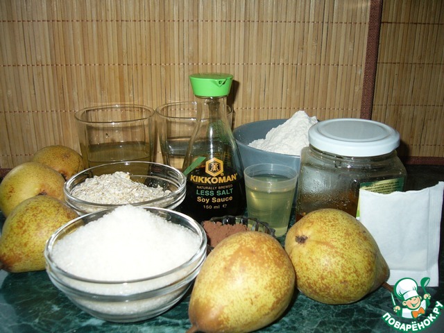 В миску натрём грушу на крупной тёрке, сверху кладём муку, смешанную с разрыхлителем, овсяные хлопья, растительное масло, грушевый сок