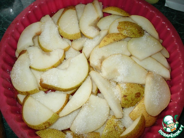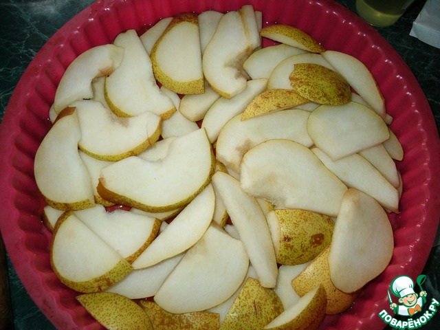 Груши режем на дольки толщиной 3 мм и укладываем на карамель