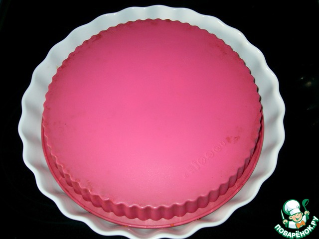 Достаём из духовки и ждём 10 минут. После чего сверху на пирог кладём блюдо, на котором будем подавать пирог, и аккуратно переворачиваем его вниз - форма с пирогом будет вверх дном