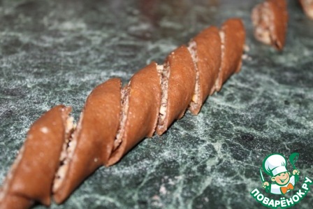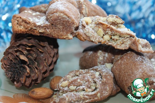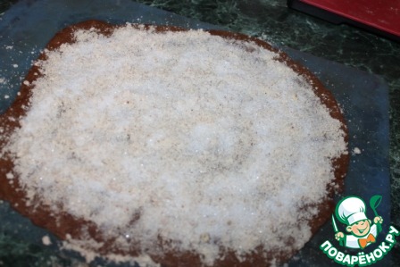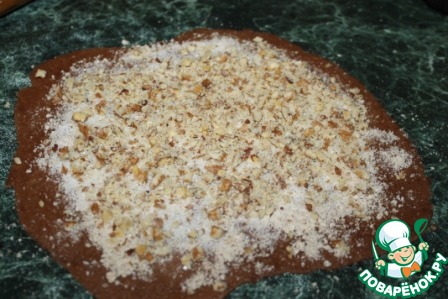 Отложенный комочек теста раскатать, посыпать также миндальной мукой (10 гр), сахаром (30 гр) и грецким орехом.