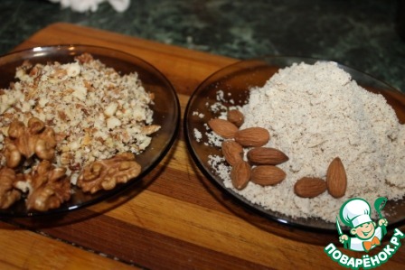 Миндаль измельчить в муку, грецкие орехи средне растолочь (не в муку, а чтоб кусочки были мелкие)