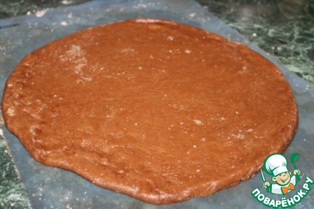 Раскатать вторую часть теста, накрыть сверху. Всё вместе чуть раскатать скалкой.