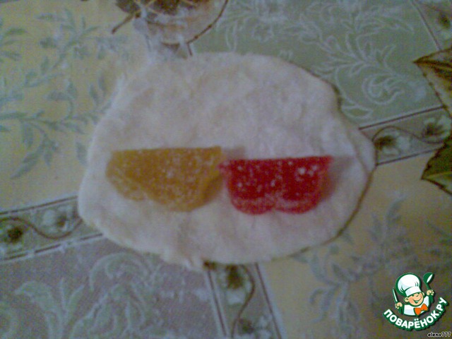 Примните кусочек теста рукой на столе, чтобы не прилипало, обмакивайте тесто в муку, положите любую начинку (ближе к одному краю), по вкусу, моим нравится с мармеладом.