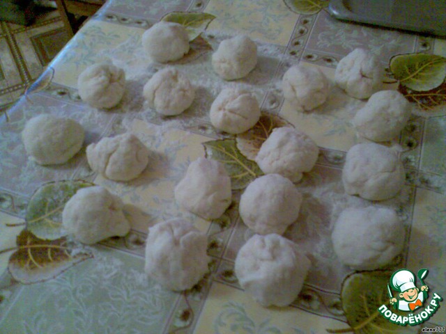 Насыпьте чуть-чуть муки на стол, тесто разделите на кусочки, размером с куриное яйцо.