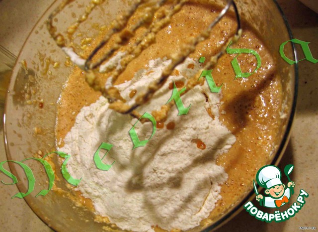 Добавляем тыквенный сок, муку, сухое молоко, разрыхлитель и замешиваем нежное однородное кремообразное тесто.