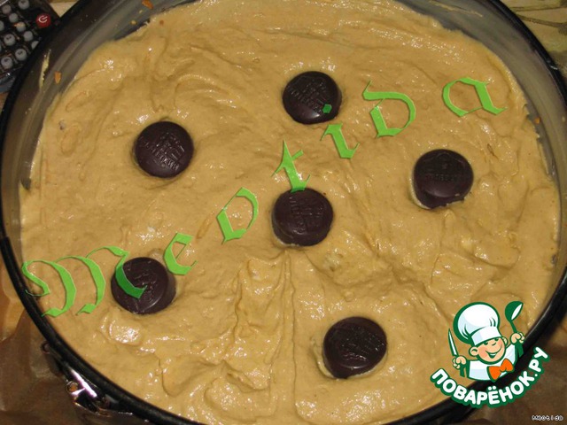 Выливаем 2/3 теста и выкладываем конфетки, хорошенько утопим их.