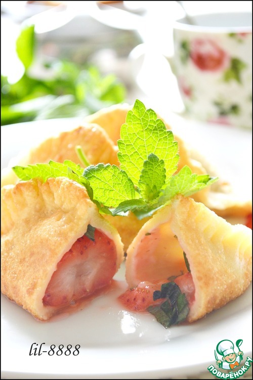 2. В центр каждого круга насыпать немного сахара, сверху положить ягоду и листик мелисы. Защипнуть хорошо края.