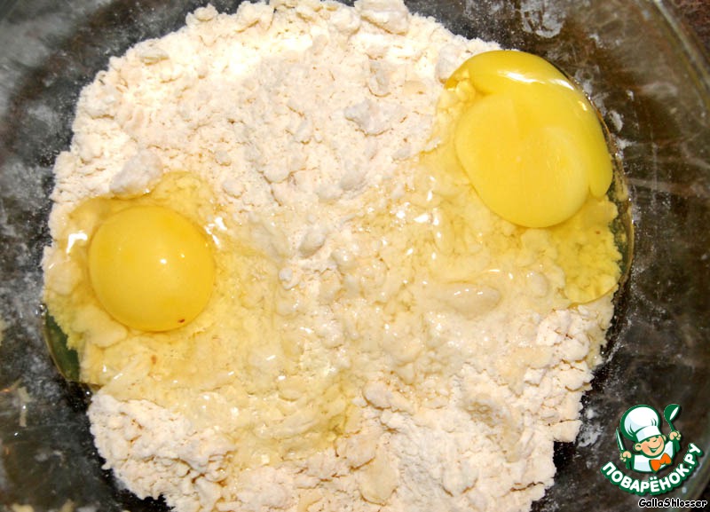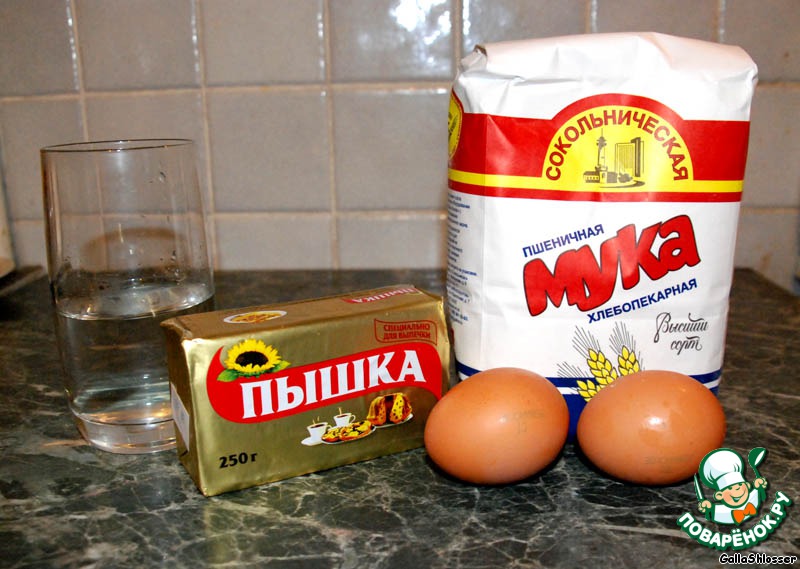 Для теста нам нужно: мука, яйца, маргарин, вода.