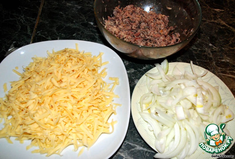 Консервы измельчить ручками, сыр потереть на крупной терке, лук нарезать тонкими полукольцами.