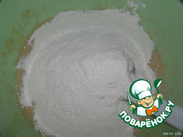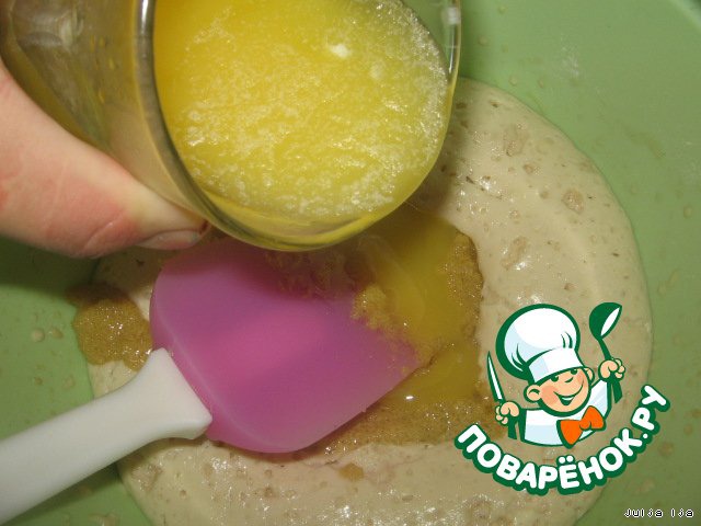 В поднявшуюся опару добавляем желтки, растопленное масло, муку (чтобы получилось тесто, как на бисквит).