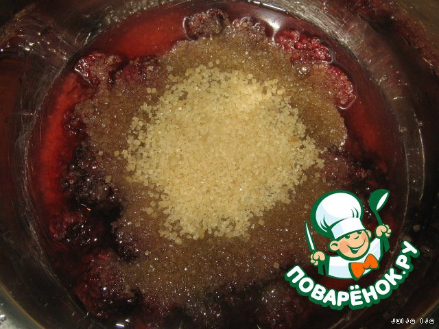 Пока тесто поднимается, приготовим джем из ежевики. Для этого ягоды разморозим (если замороженные), добавим 0,5 стакана сахара и пару ложек воды. Варим до загустения, минут 15, помешивая. Жидкости должно остаться мало.