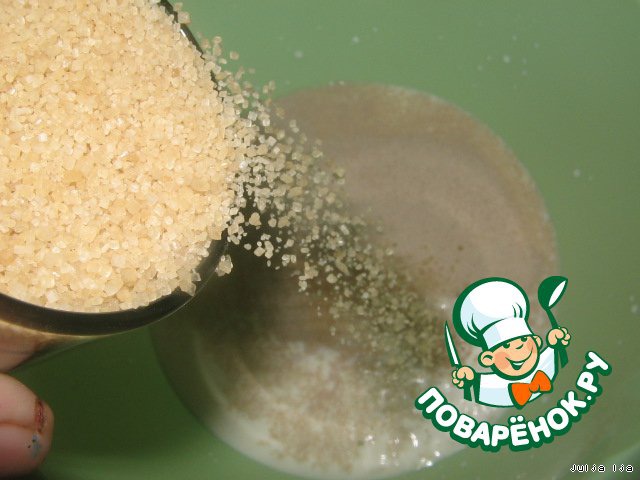 Добавляем немного сахара и муки. Чтобы получилось жидкое тесто. Оставляем для подъёма, минут на 20, в тёплом месте.