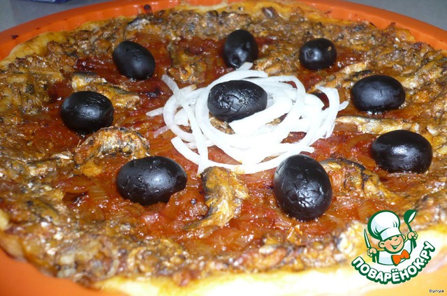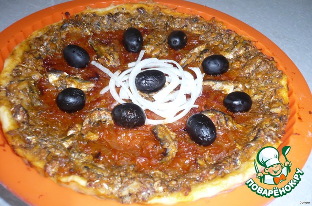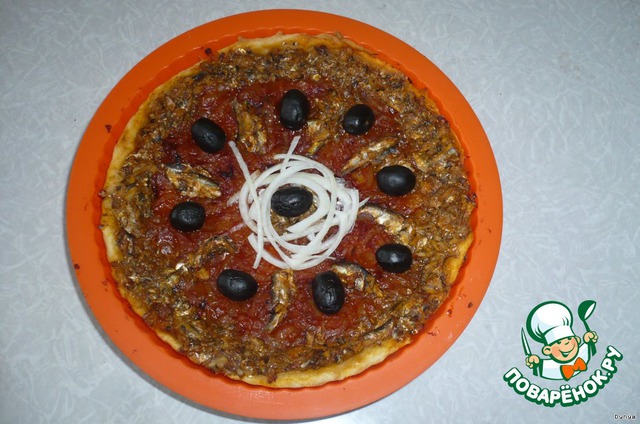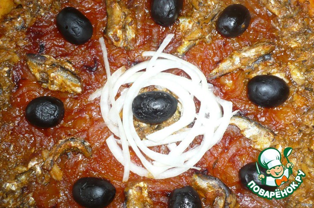 Уложить на тесто луковую смесь ровным слоем. Поверх начинки положить филе кильки. Украсить маслинами. Выпекать 30 мин.