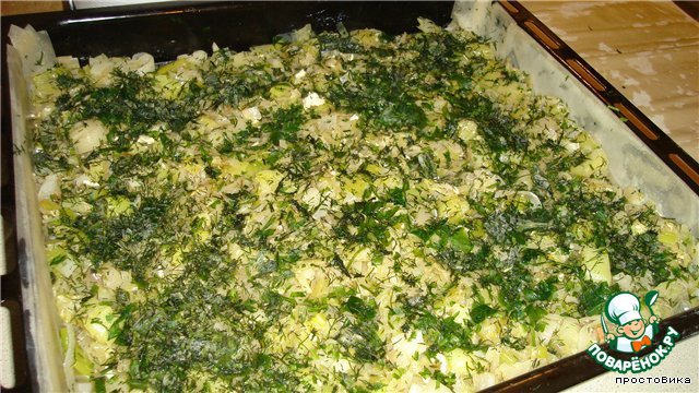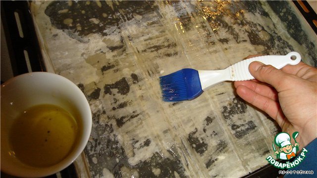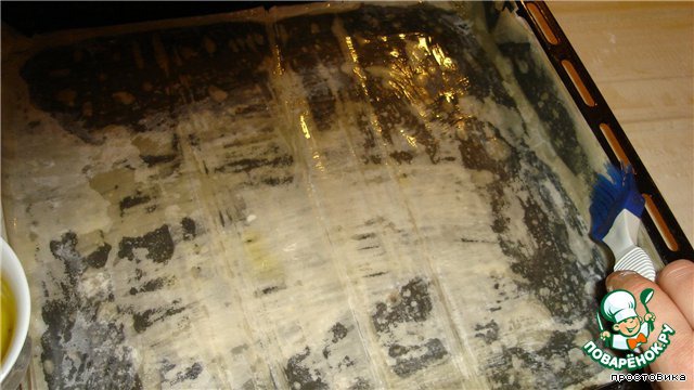 В то время как тушатся все компоненты, выкладываю на смазанный маслицем противень половину слоёв теста.