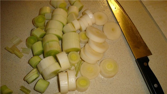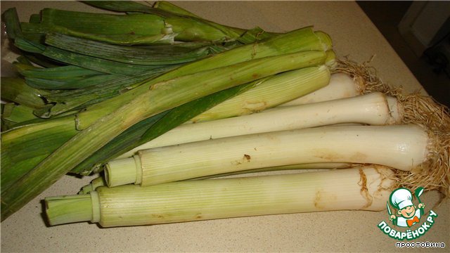 Лук-порей чистим, моем, обрезаем его в том месте, где начинаются зелёные листики - эту часть выкидывают, так как она горчит!