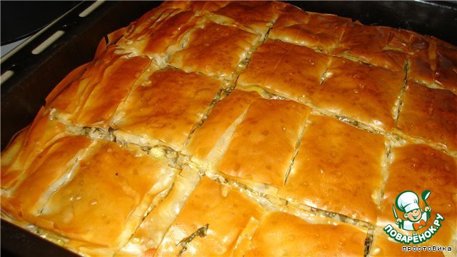 Затем укладываем на начинку остальные слои теста, так же каждый промазываем и надрезаем ножом на куски, чтобы потом легче было резать порции, так как тесто получается хрустящее