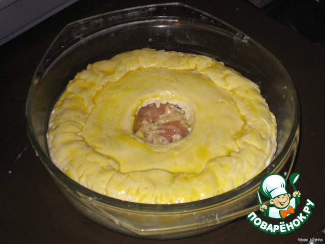 Сверху накрываем вторым пластом теста, чуть потоньше. Слепливаем края, в серединке делаем отверстие (чтобы пирог не надулся во время приготовления). Смазываем сверху взбитым желтком и в духовку на 40 минут!