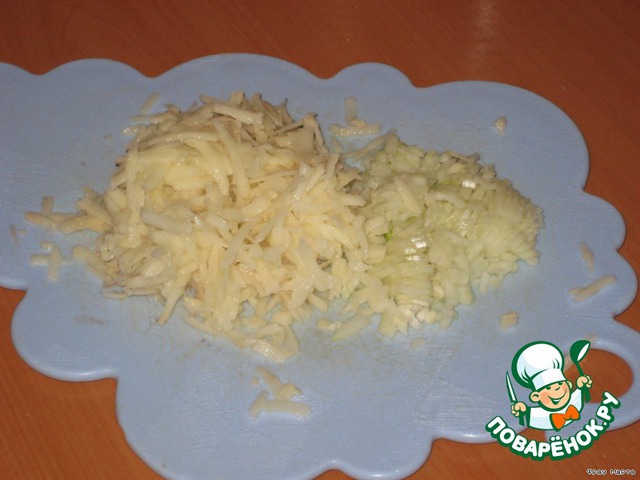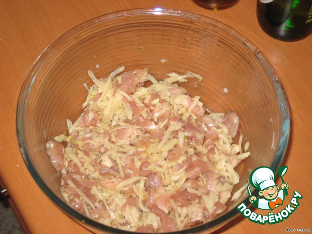 Курицу, картофель, лук перемешиваем вместе, солим и перчим по вкусу. И добавляем 3-4 ст. ложки воды для сочности.