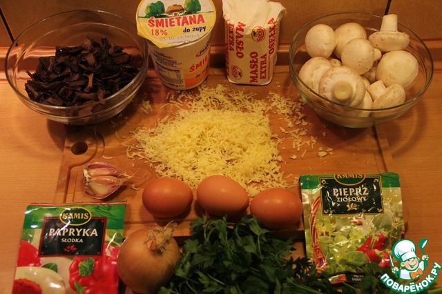 1. На сковороде растопить масло, обжарить лук до золотистого цвета и добавить порезанные шампиньоны. Прожарит 3-5 минут, снять с огни и слить воду. Отставить. 2. Порезать сваренные сушёные грибы. 3. Соединяем сметану с сыром и яйцами. 4. Добавляем грибы, порубленную зелень, соль, приправы.