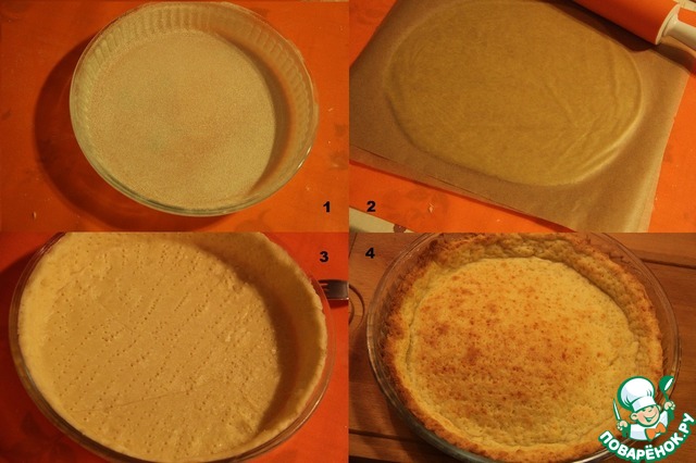 1. Форму под тарт смазать сливочным маслом и обсыпать мукой. 2. Тесто вынуть из холодильника, положить между бумагами для выпечки и раскатать. 3. Осторожно переложить тесто в форму, и густо проколоть вилкой. Поставить в холодильник на 15 минут. 4. Выпекать при температуре 200*С 15 минут.