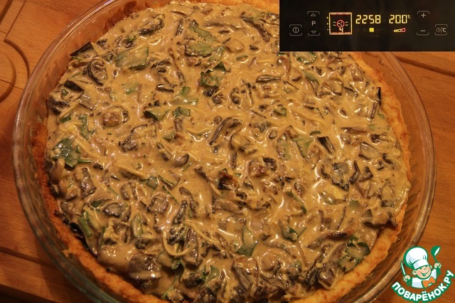 В под печёное тесто выливаем нашу грибную смесь и отправляем в духовку на 30 минут.