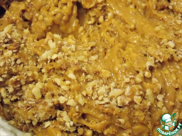 Муку смешать с разрыхлителем и просеять. Соединить с тестом и хорошо перемешать. Орехи измельчить не очень мелко и добавить в тесто. Все еще раз хорошенько перемешать.