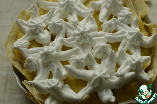 8. Для меренги белки взбить с сахарной пудрой до крепких пиков. Сверху, с помощью кондитерского мешка или ложкой, отсадить меренгу. Поставить на 2 минуты под горячий гриль или слегка пройтись специальной горелкой, чтобы подрумянить меренгу.