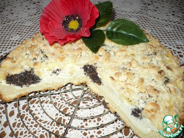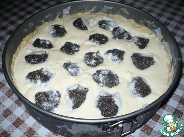 Для начинки творог смешать с сметаной и сахаром, затем добавить яйца и крахмал при этом хорошенько перемешать. Форму с тестом и шарики достаем с морозилки, начинку выливаем в форму и по ней вдавливаем маковые шарики