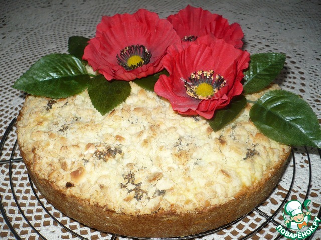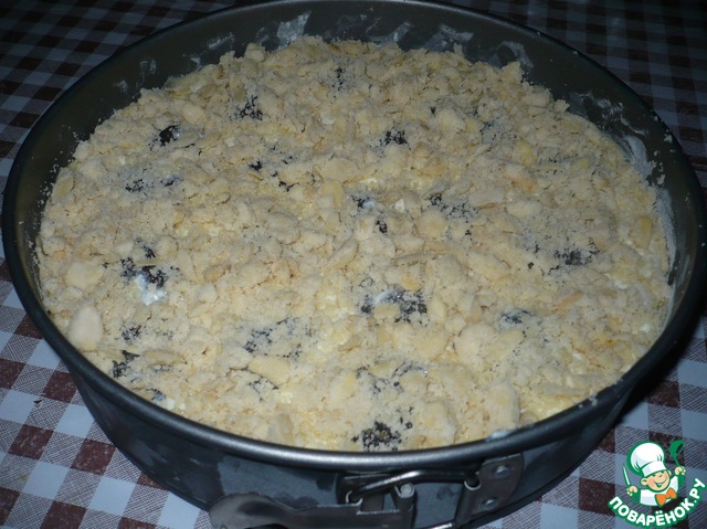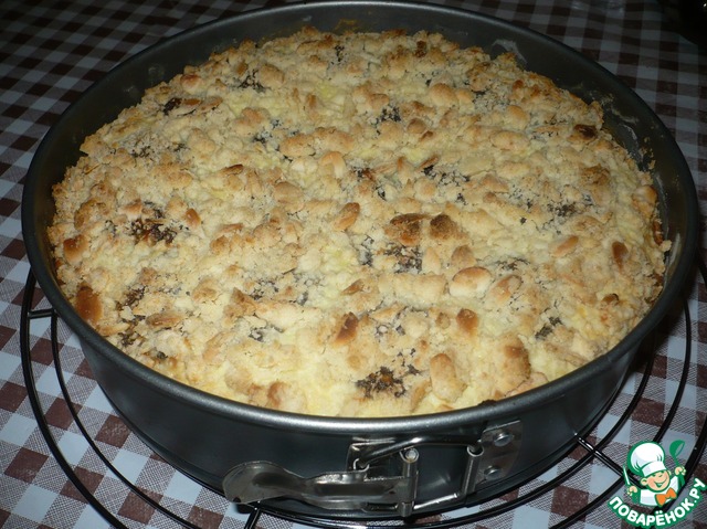 Для крошки берем миндальные лепестки смешиваем с сахаром по капельки вводим топленое масло и разминаем в крошку, этой крошкой покрываем пирог и ставим в уже разогретую духовку и печем 45 мин при 180 гр