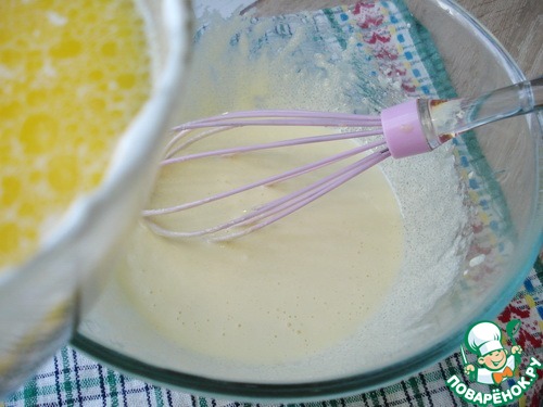 Масло сливочное растопить, смешать с молоком и сметаной, вылить в сахарно-желтковую массу размешать.