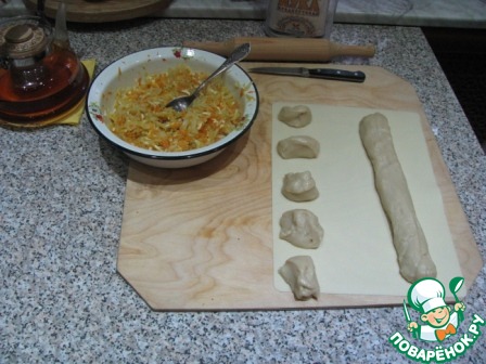 Тесто раскатаем в трубочку и нарежем на равные кусочки. У меня их получилось 12.