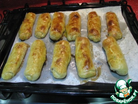 На раскатанный пласт, отступив по 2 см, с краев, выкладываем начинку.