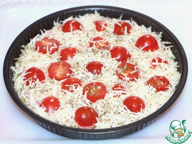 Сверху выкладываем помидоры и посыпаем промежутки между помидорами сыром.