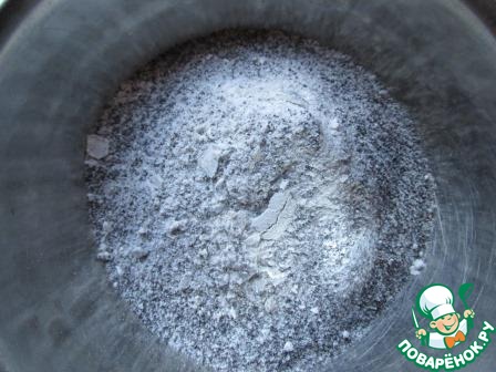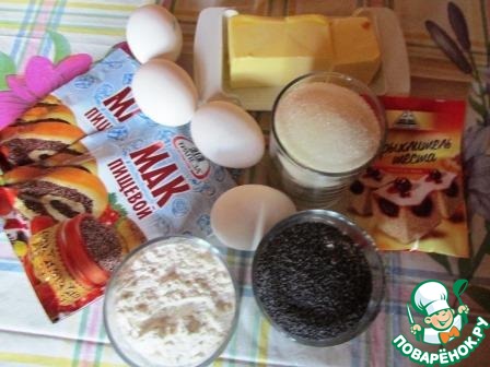 Смешать муку с разрыхлителем, добавить мак с сахаром, перемешать и всыпать в яично-масляную смесь. Перемешать.