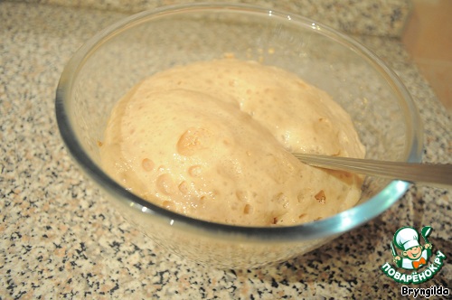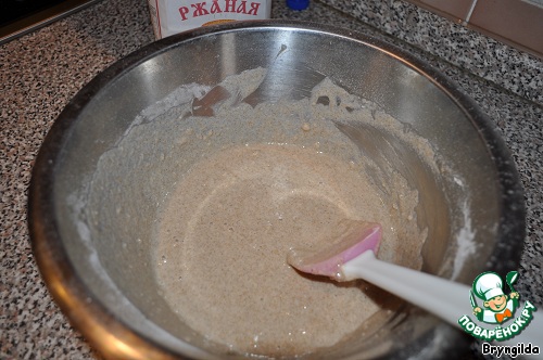 Ржаную муку заливаю водой, добавляю сахар и соль, размешиваю и даю настояться, пока не поднимутся дрожжи.
