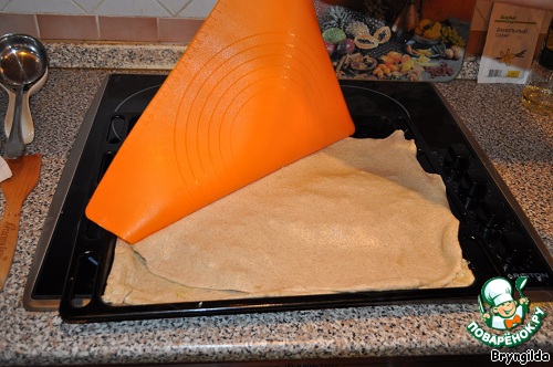 Раскатываю тонко верхний корж и тоже с помощью коврика переношу на лист.