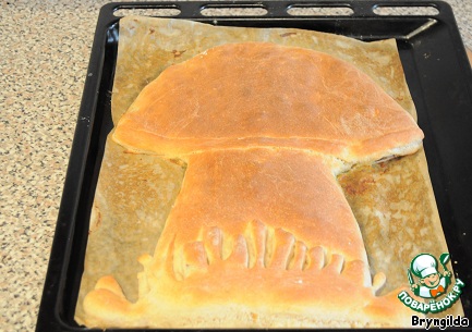 Вырезаю пирог в форме гриба. Хочу сразу оговориться - пироги в форме гриба я пеку уже лет 20, кому принадлежит авторство, не знаю, меня этому научила моя приятельница из тогда еще Ленинграда Вика Таранник, пути наши потом разошлись. Вика, если ты прочтешь этот рецепт, может, отзовешься, как я была бы рада увидеть тебя вновь!