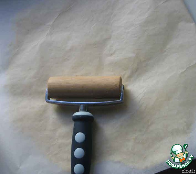 раскатываем тесто между двумя листами бумаги для выпекания в тонкий круг