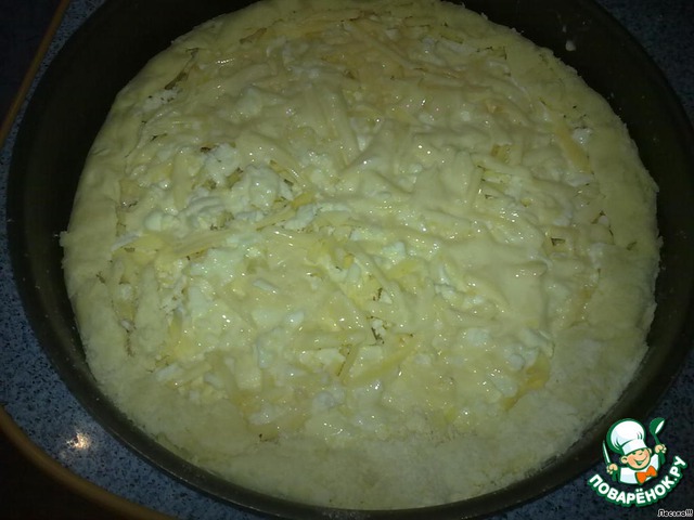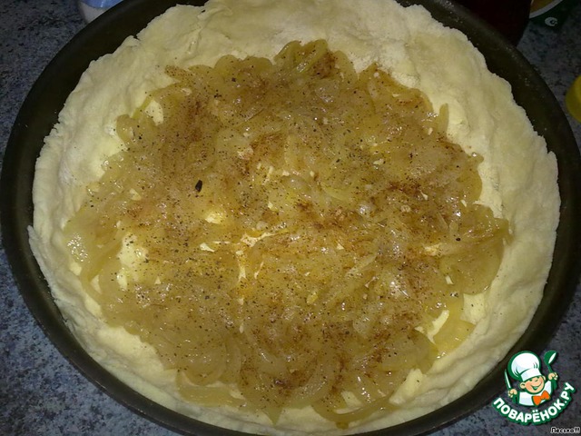 Выкладываем в форму на тесто. Посыпаем специями(особенно вкусен мускатный орех и перец черный).