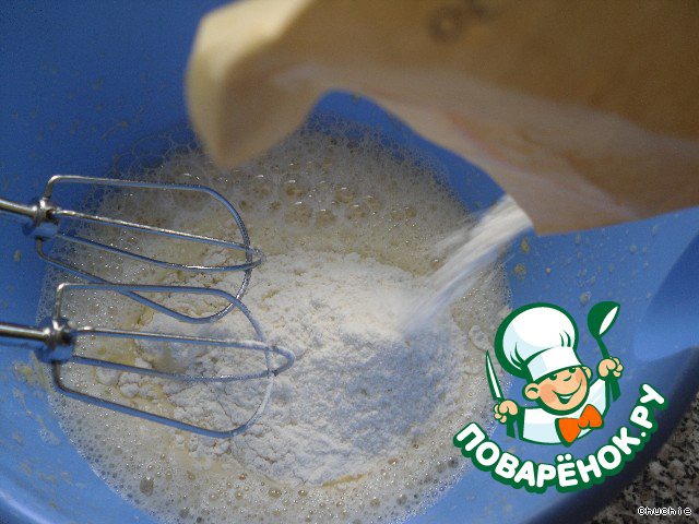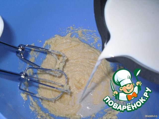 Добавить молоко с дрожжами к маслу, всё взбить.