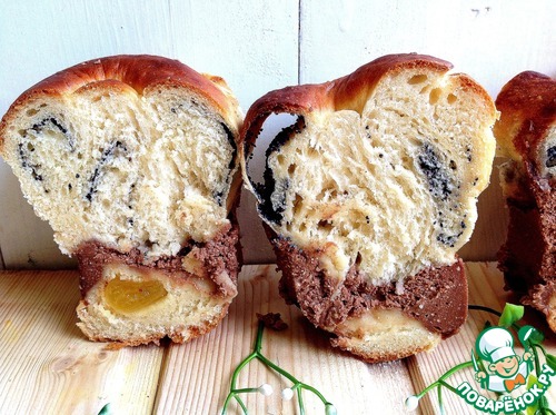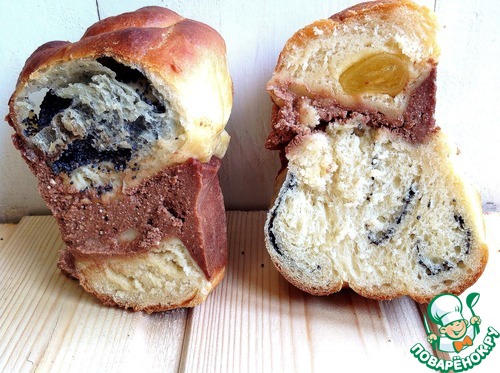 | Хочу предложить Вам наивкуснейшую дрожжевую выпечку с шоколадным творогом, который превращается в нежнейшее суфле и держит на своих "плечах" ароматную выпечку с различной начинкой. Заходите посмотреть на разрезик! |