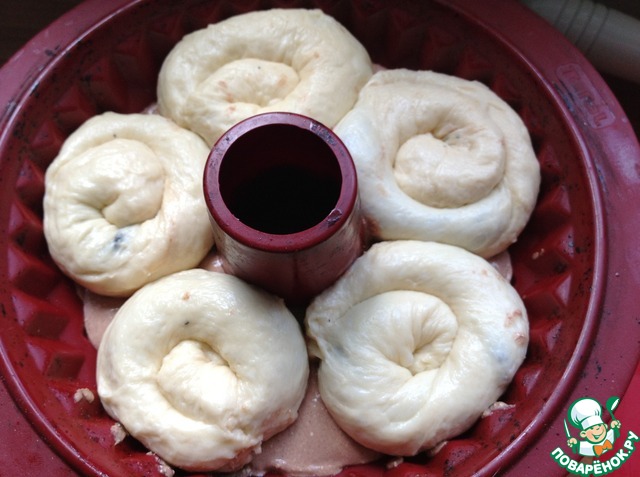 Из готового теста нарвать шарики размером с крупную сливу. Расплющить и в центр выложить свою любимую начинку. У меня это вяленые клюква и лимон. Если требуется подсыпаем муки для раскатки. Формируем как обычные круглые булочки и выкладываем в форму по очередно с разной начинкой. У меня форма силиконовая и я ее ничем не смазываю.