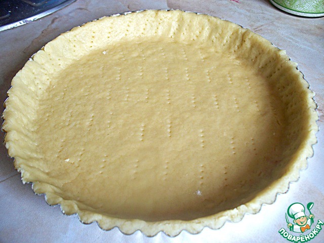 Теперь формируем корж. Тесто придавить к форме, обрезать лишнее лопаткой. Вилкой накалоть тесто по всему диаметру, только не насквозь. Накалываем для того, что бы тесто не вздувалось.