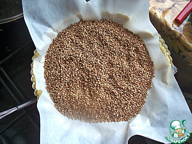 Накрываем тесто пергаментом, засыпаем "грузом". (можно использовать горох, фасоль, но я взяла гручку) "Груз" для того, что бы тесто не вздувалось. Выпекаем тесто в разогретой духовке на 200 градусов, 10-15 минут.