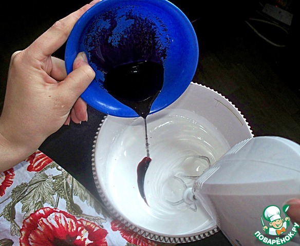 Крем взбиваем до густого состояния, добавляем выпаренный вишневый сок (выпаривание:сок вылить в металическую миску, поставить на огонь, кипятить до состояния жидкого концентрированного сиропа)