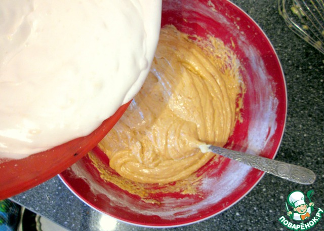 Аккуратно смешиваем желтки с половиной взбитых белков.